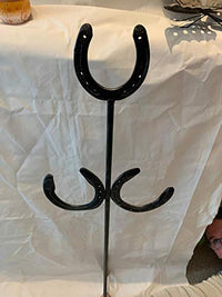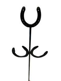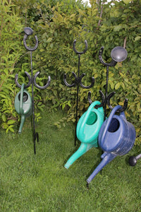 Dieser außergewöhnliche Gießkannenhalter aus echten, getragenen Hufeisen verbindet rustikalen Charme mit praktischer Funktion. Mit einer Gesamthöhe von ca. 115 cm bietet er ausreichend Platz für mehrere Gießkannen samt Zubehör.